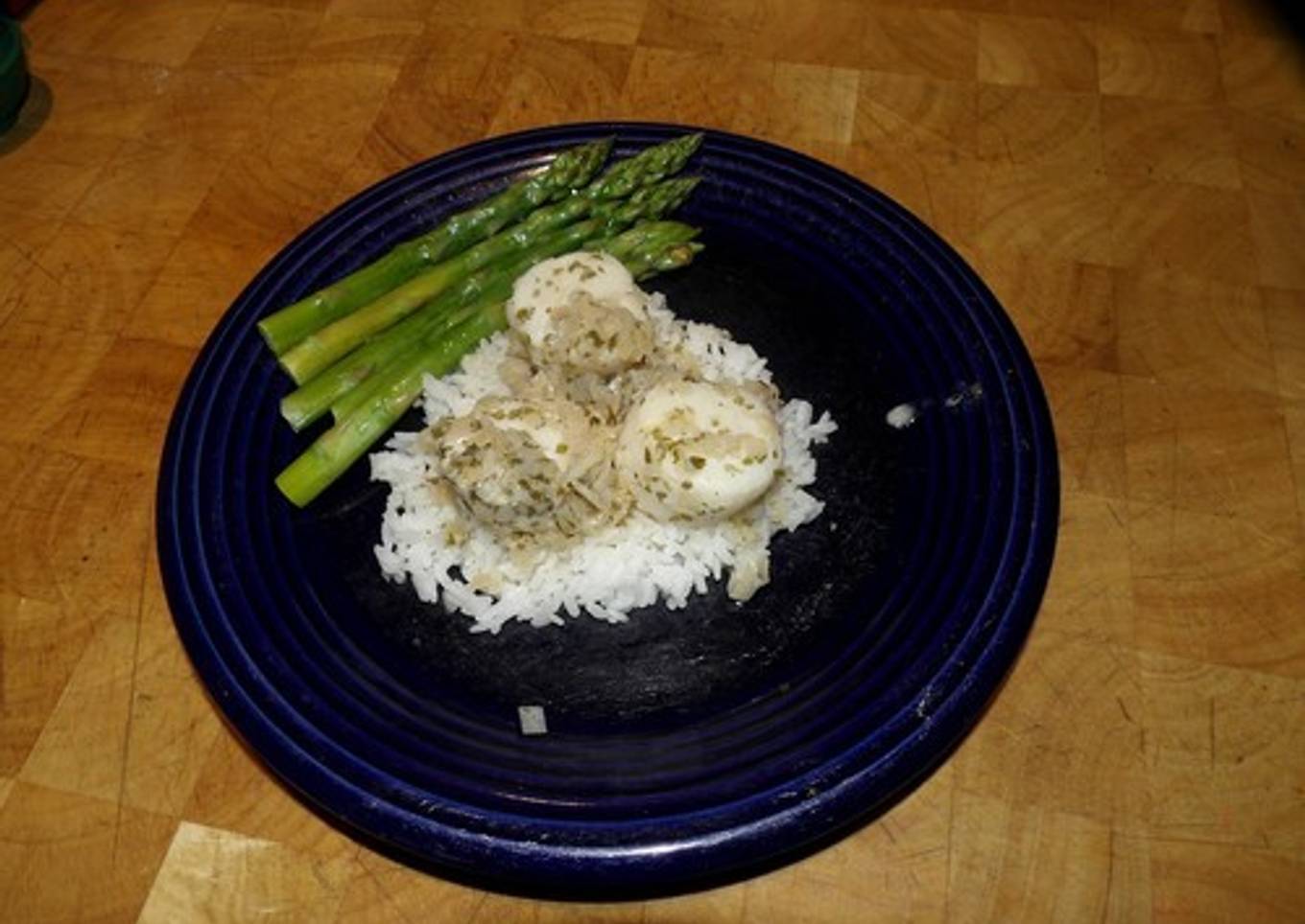 - Serve immediately with rice pilaf. I also served steamed Asparagus. And a good white wine of your choice.