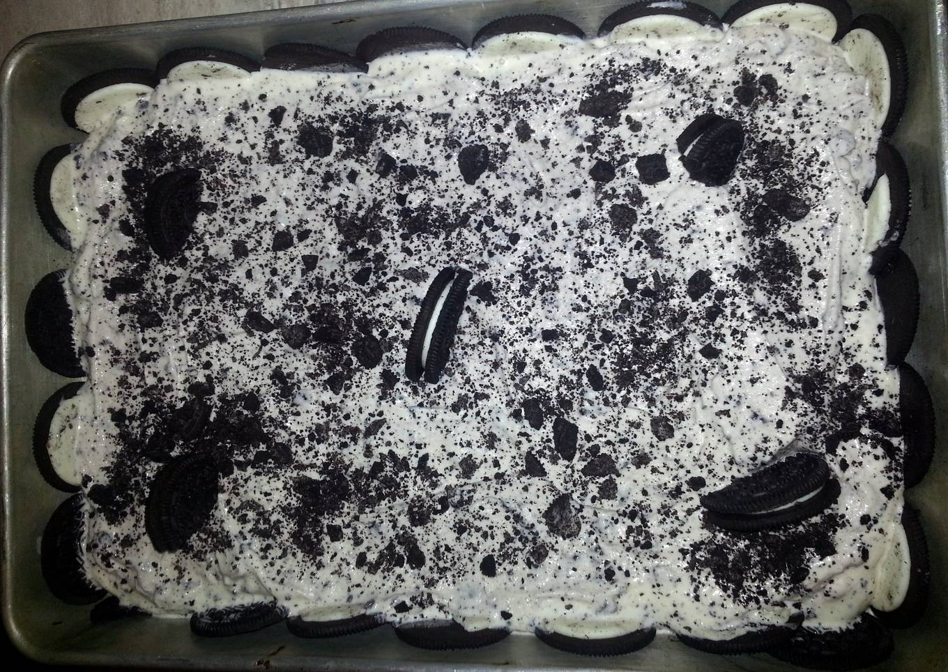 - open half the cookies, decorate the side and down of pan with Oreos