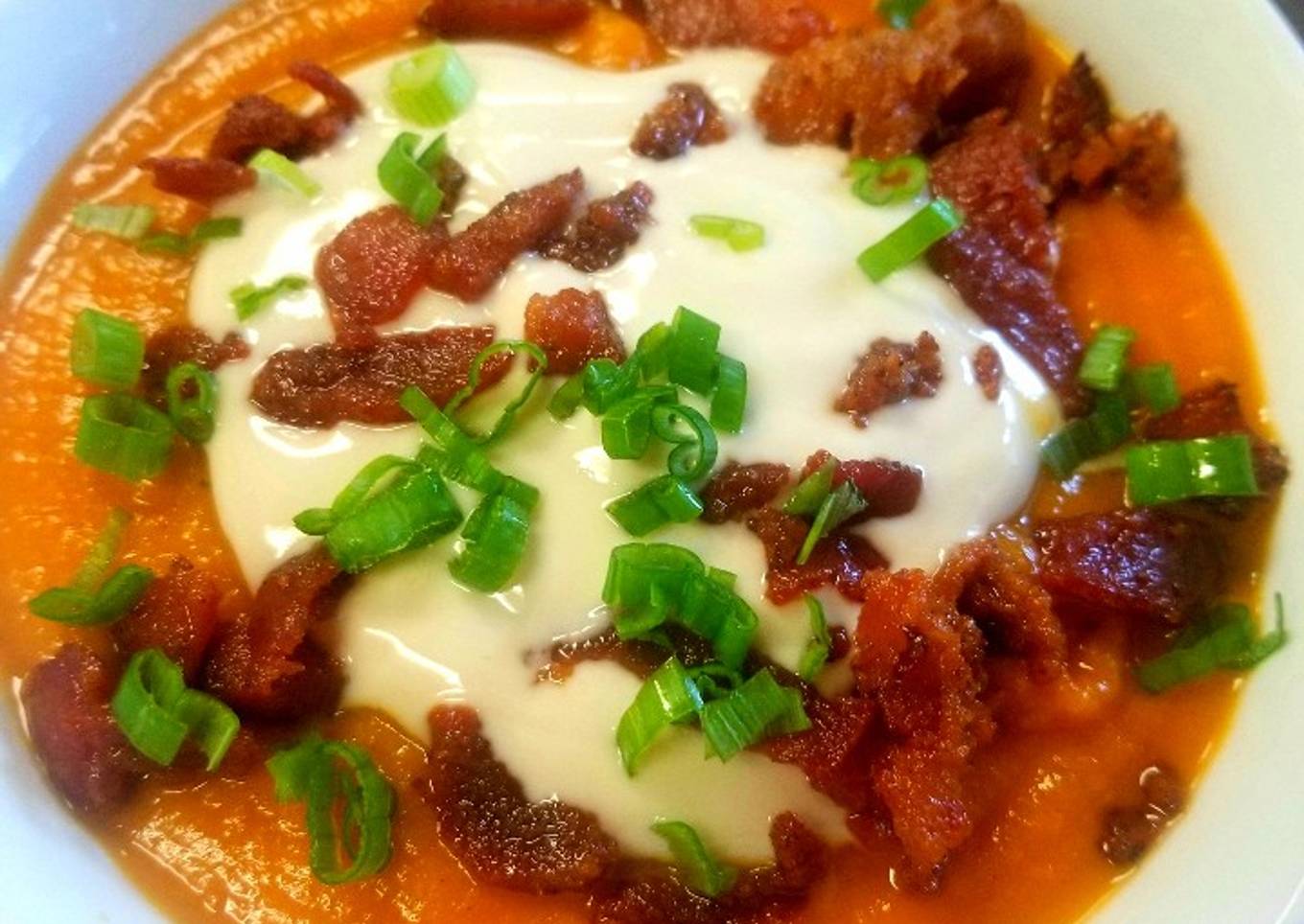 Sweet Potato Soup With Maple Sour Cream and Candied Bacon