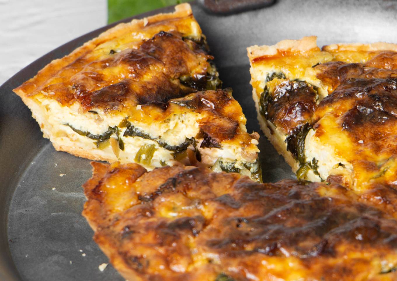 - Take out the prepared crust. Place spinach on the bottom of the crust and layer with fried guanciale. Carefully pour over the liquid mixture all the way to the edge.