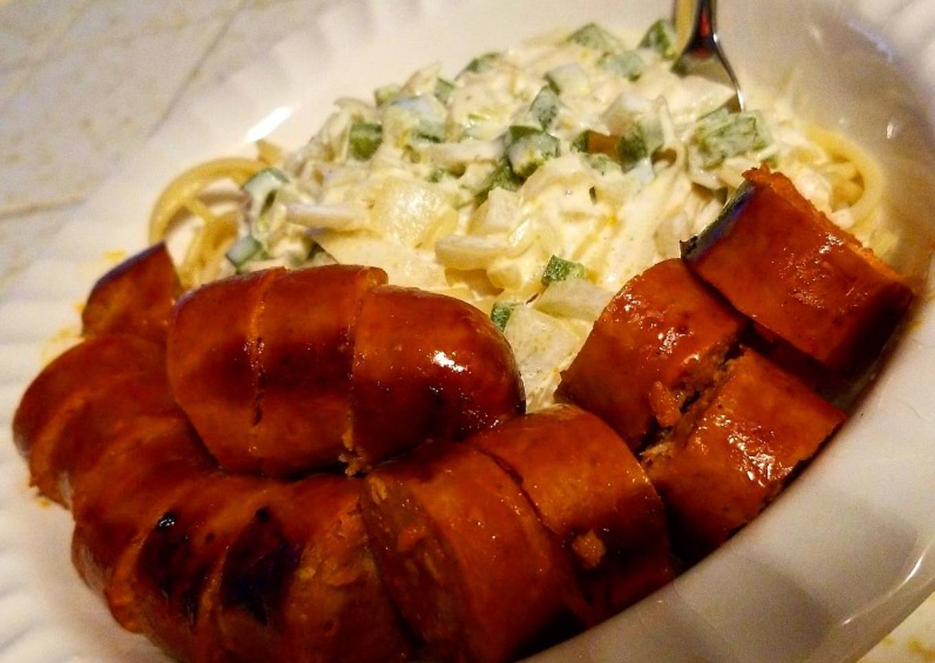- Boil water for pasta with pinch of salt, add pasta when boiling. At the same time, prepare meat of your choice. (I just threw frozen Linguiça in a pan until hot)