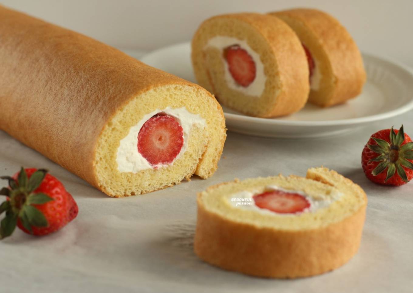 Here is an airy and light strawberry swiss roll cake, made with simple ingredients. It almost tastes like strawberry shortcake but simpler in form and baking process. For a sweeter version, we can also add a layer of strawberry jam 😋