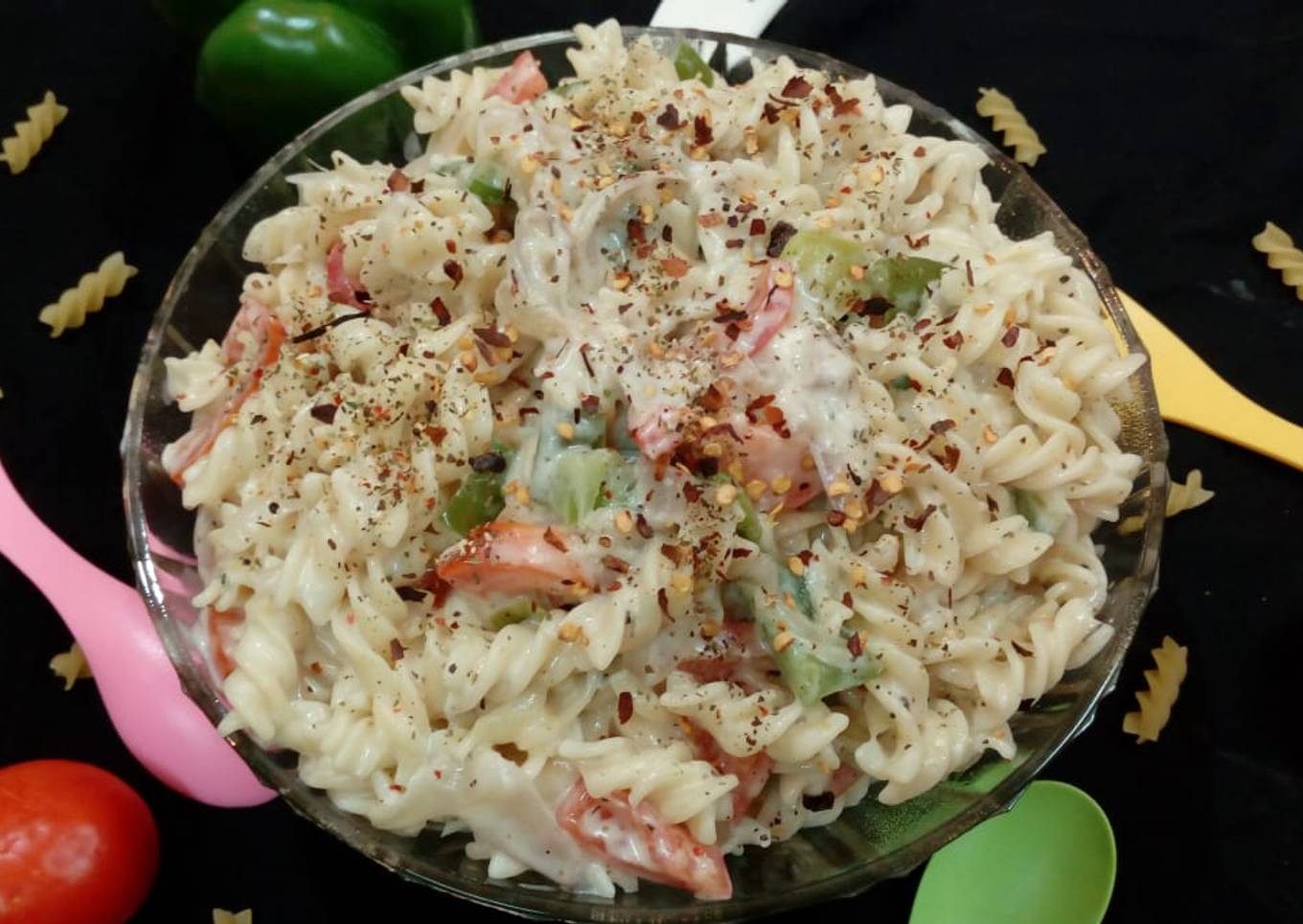 - Add salt and pepper. Mix well. Add boiled pastas. Stri it and add white sauce, cheese cream.