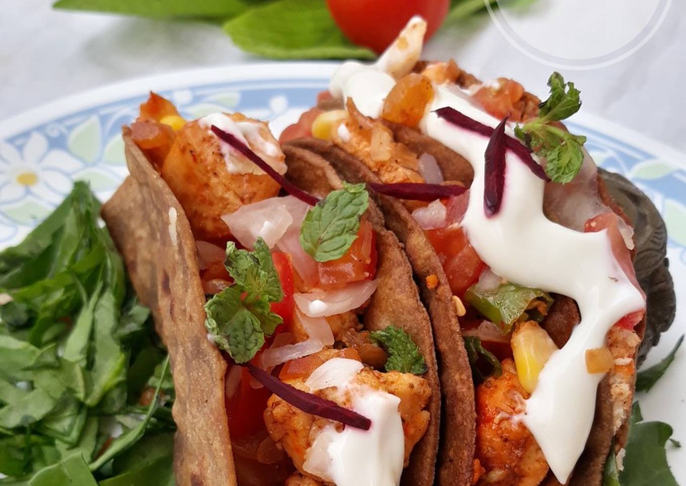 - ASSEMBLING: Take taco shell fill paneer and corn stuffing in it. Then put some tomato salsa over it. Repeat the process with all 4. Garnish with sour cream, beetroot julienne and mint leaves.