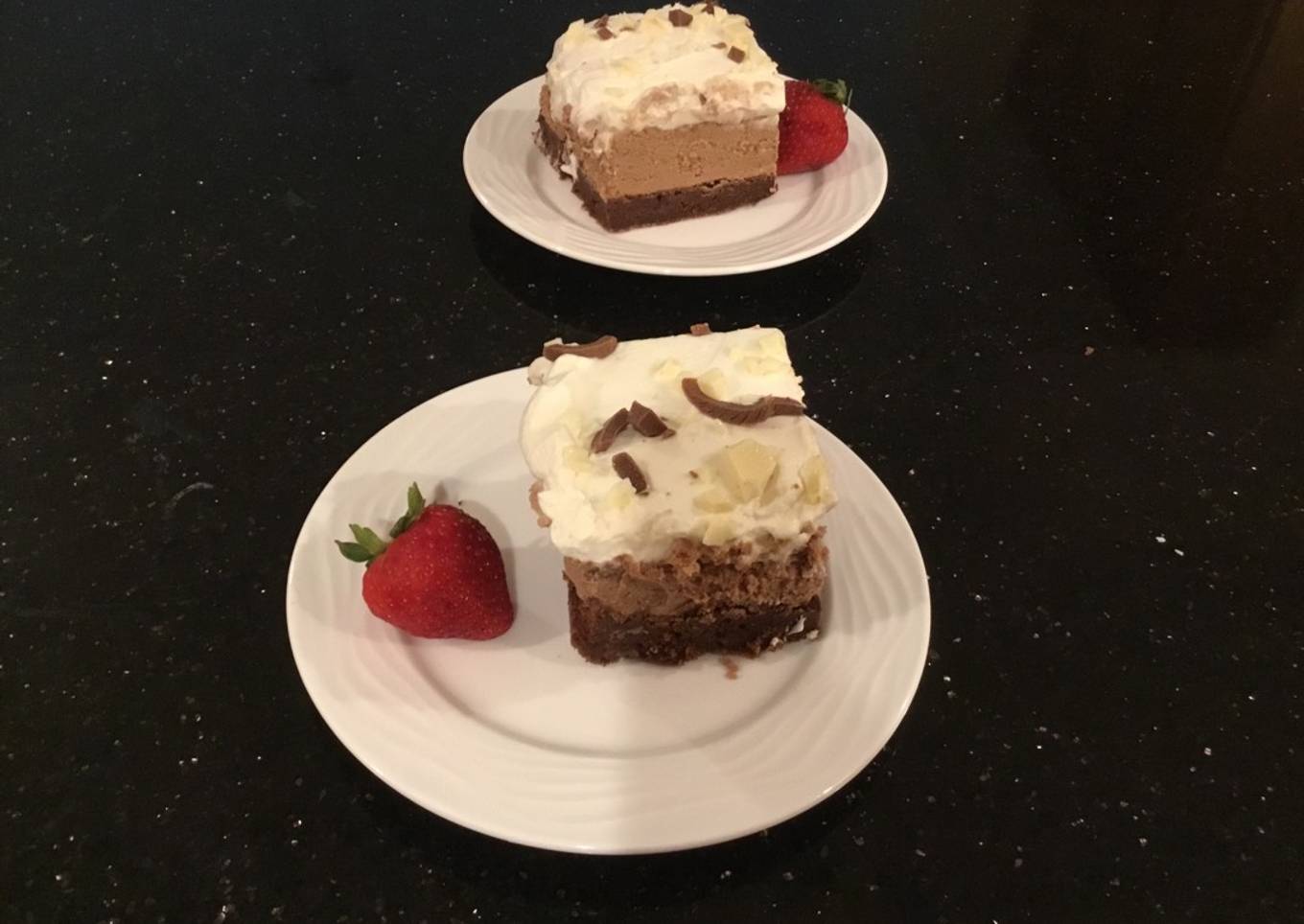 These fudge brownies, one of the first items I ever baked many years ago is still my go to brownie. I have transformed it into many recipes and this is just another one. I have topped the fudge brownies with a Creamy take on French Silk pie. The result is a dressed up brownie that is delicious!