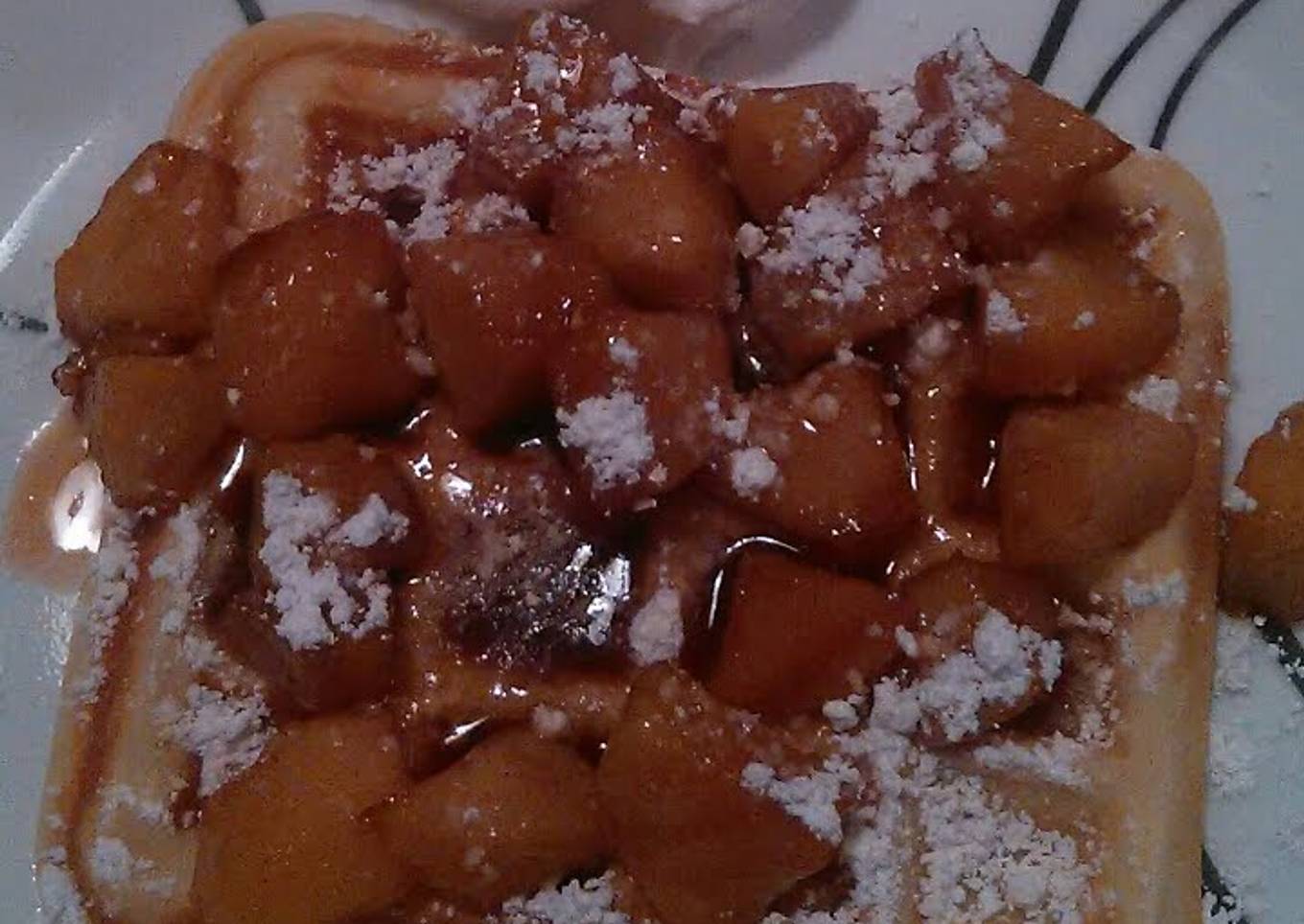 - Finally put a scoop of apple compote on top of waffle and sprinkle with powdered sugar. If desired serve with whip cream.