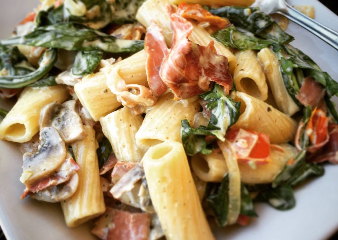 Creamy Rigatoni with Basil Pesto & Prosciutto