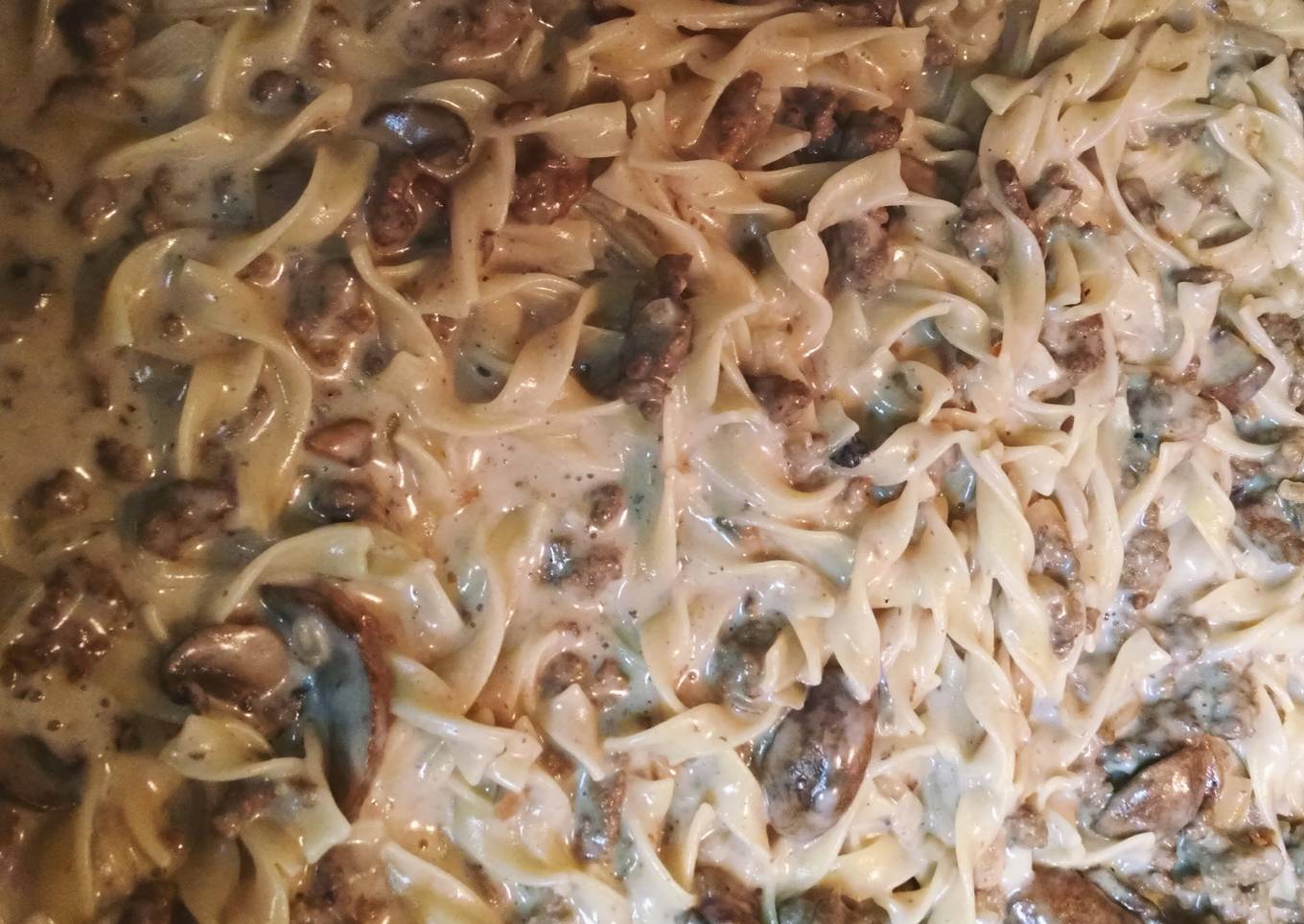 - Cook pasta, drain, set aside. Saute beef, drain, return to pan, add mushrooms, heavy cream, soup mix, can of soup, simmer for 10 minutes.