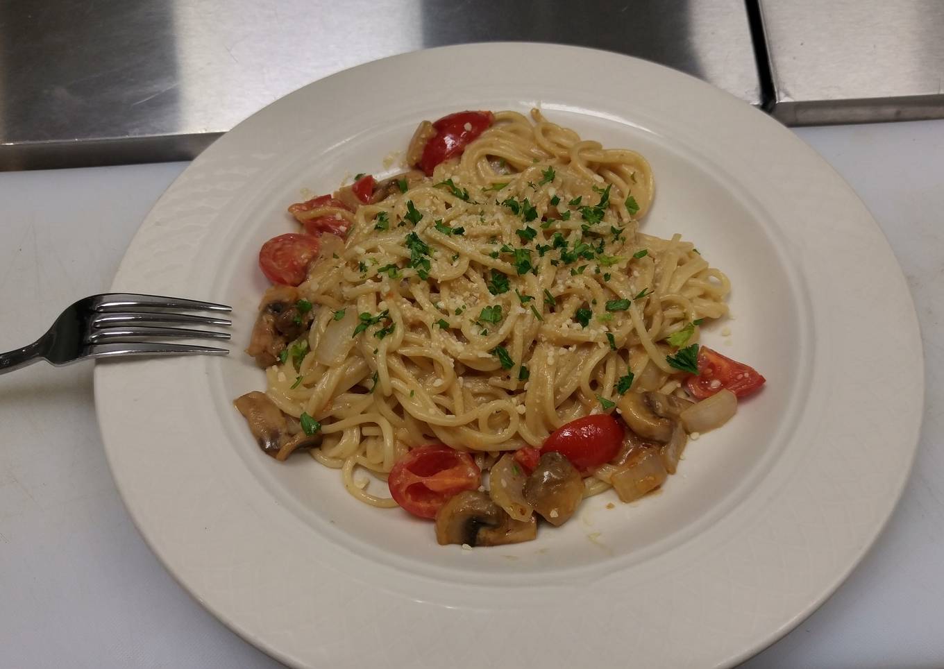 - In a medium pan add 1 tbsp of olive oil onion tomatoes and mushrooms and saute for 5 minutes. After 5 minutes poor your sauce in the pan and mix for 2 minutes. Add pasta into mixture and toss for 5 minutes, add parmesan and parsley and serve.