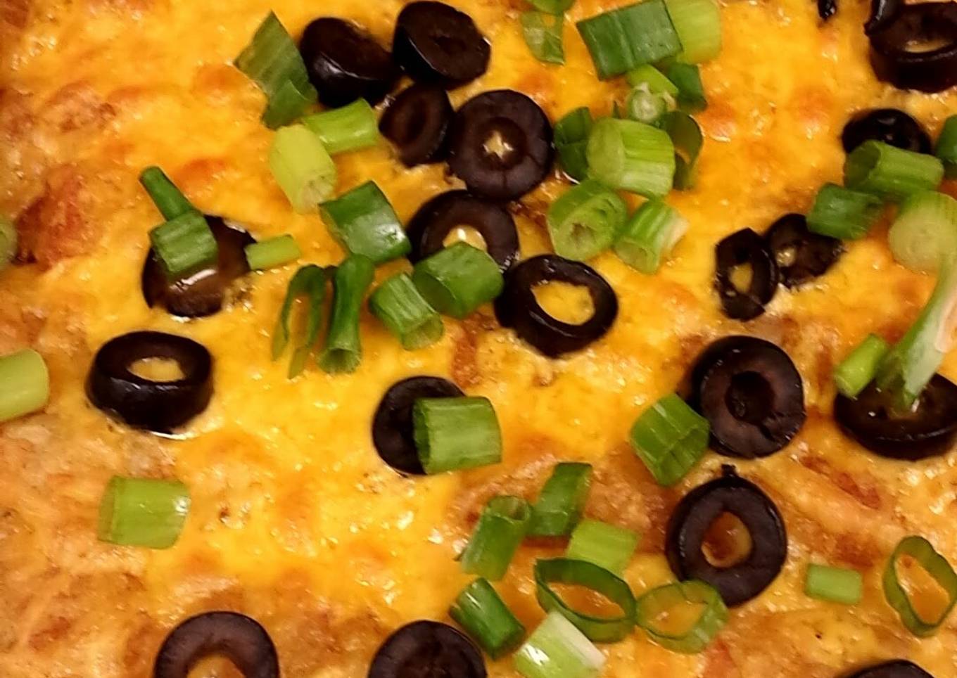 - Add about 2 cups of shredded Cheese on top of the tatertot's evenly & drain olives & add those as well. (I used cheddar cheese). Then broil for 4-5 minutes in oven or until cheese is slightly browned.