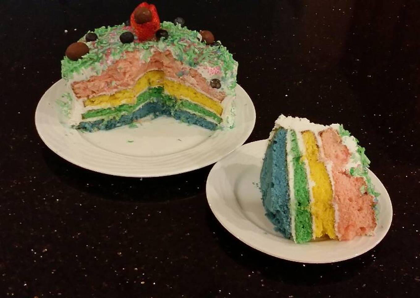 - Fill prepared cake pans with each color and bake about 15 to 18 minutes, until a toothpick comes out just clean. Cool 15 minutes in pans then remove to cool completely on wire racks